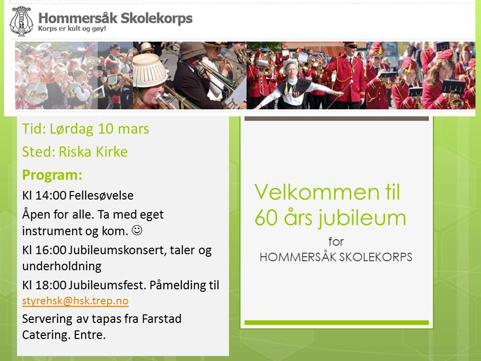 Kl 18:00 Jubileumsfest. Påmelding til styrehsk@hsk.trep.no